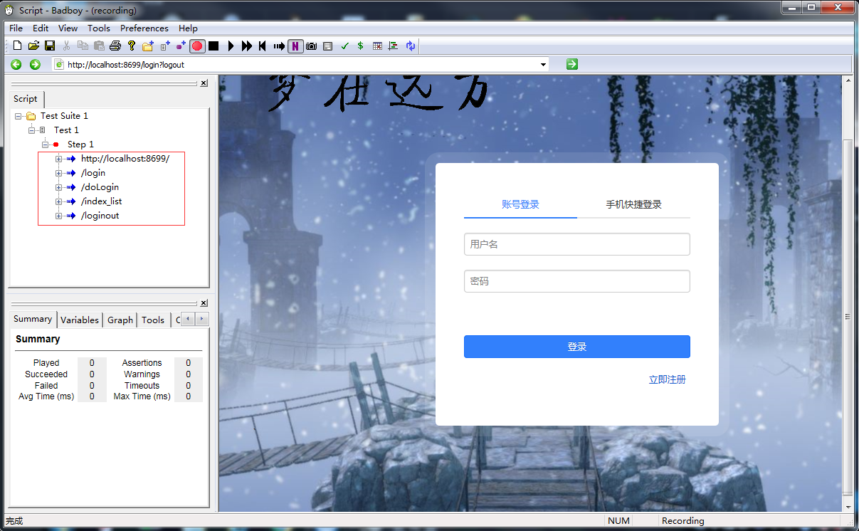 然后点击登录,访问首页,然后退出,badboy界面如下,总共有五条记录